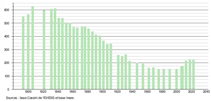 L'évolution du nombre d'habitants est connue à travers les recensements de la population effectués dans la commune depuis 1793. Pour les communes de moins de 10 000 habitants, une enquête de recensement portant sur toute la population est réalisée tous les cinq ans, les populations de référence des années intermédiaires étant quant à elles estimées par interpolation ou extrapolation[23]. Pour la commune, le premier recensement exhaustif entrant dans le cadre du nouveau dispositif a été réalisé en 2007[24].