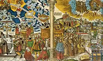 Cette gravure est une allégorie composée de deux parties qui s'opposent de part et d'autre d'une colonne, la gauche représentant le protestantisme (ou « Vraie Église ») et la droite le catholicisme (ou « Fausse Église »).