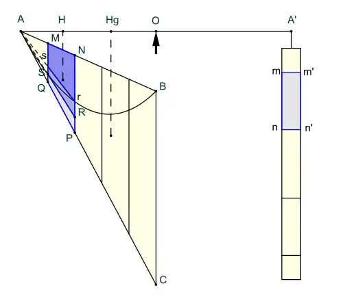 Pour équilibrer le triangle ABC suspendu à son centre de gravité, il faut placer en A' un objet dont l'aire est le tiers de l'aire du triangle. Archimède découpe alors le triangle ABC en tranches de même largeur et équilibre chaque tranche. Ainsi la branche MNPQ est équilibrée par le rectangle mm'n'n. Le nœud de la démonstration consiste à prouver que l'aire de ce rectangle est comprise entre les aires des trapèzes MNRS et MNrs (propositions VIII et IX pour la première tranche - triangle, X et XI pour les centrales, XII et XIII pour la dernière). Or l'aire de la tranche de parabole est également comprise entre ces deux aires. L'aire totale de l'objet placé en A' ainsi que l'aire totale de la portion de parabole sont toutes deux encadrées par les sommes des trapèzes (somme des grands et somme des petits) (propositions XIV et XV). Les propositions sont traitées par paires car Archimède envisage deux cas selon que la corde est perpendiculaire ou oblique à l'axe de la parabole.