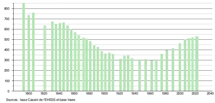 L'évolution du nombre d'habitants est connue à travers les recensements de la population effectués dans la commune depuis 1793. Pour les communes de moins de 10 000 habitants, une enquête de recensement portant sur toute la population est réalisée tous les cinq ans, les populations de référence des années intermédiaires étant quant à elles estimées par interpolation ou extrapolation[33]. Pour la commune, le premier recensement exhaustif entrant dans le cadre du nouveau dispositif a été réalisé en 2006[34].