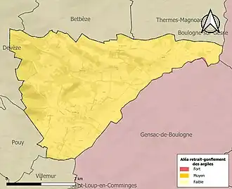 Le retrait-gonflement des sols argileux est susceptible d'engendrer des dommages importants aux bâtiments en cas d’alternance de périodes de sécheresse et de pluie. La totalité de la commune est en aléa moyen ou fort (44,5 % au niveau départemental et 48,5 % au niveau national). Sur les 50 bâtiments dénombrés sur la commune en 2019, 50 sont en aléa moyen ou fort, soit 100 %, à comparer aux 75 % au niveau départemental et 54 % au niveau national. Une cartographie de l'exposition du territoire national au retrait gonflement des sols argileux est disponible sur le site du BRGM[32],[Carte 3].