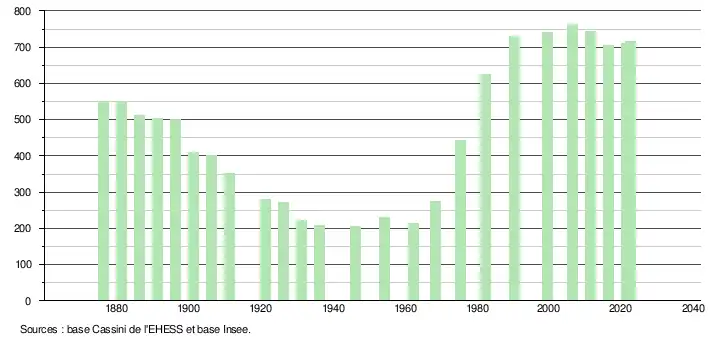 L'évolution du nombre d'habitants est connue à travers les recensements de la population effectués dans la commune depuis 1876. Pour les communes de moins de 10 000 habitants, une enquête de recensement portant sur toute la population est réalisée tous les cinq ans, les populations de référence des années intermédiaires étant quant à elles estimées par interpolation ou extrapolation[42]. Pour la commune, le premier recensement exhaustif entrant dans le cadre du nouveau dispositif a été réalisé en 2006[43].