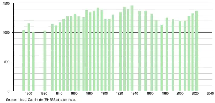 L'évolution du nombre d'habitants est connue à travers les recensements de la population effectués dans la commune depuis 1793. Pour les communes de moins de 10 000 habitants, une enquête de recensement portant sur toute la population est réalisée tous les cinq ans, les populations de référence des années intermédiaires étant quant à elles estimées par interpolation ou extrapolation[22]. Pour la commune, le premier recensement exhaustif entrant dans le cadre du nouveau dispositif a été réalisé en 2006[23].