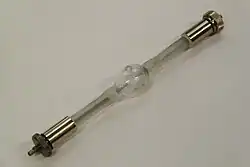 Les lampes aux halogénures métalliques sont des lampes à arc de taille moyenne avec cycle halogène. Elles sont relativement similaires aux lampes à vapeur de mercure mais les éléments constitutifs sont différents. L'ampoule est composée d'une sphère (le bulbe) en quartz[13] résistant à la pression (35 bars)[13] et à la température (950 °C)[13] et de forte épaisseur (jusqu'à 5 mm)[13] associée à deux longues électrodes[13].