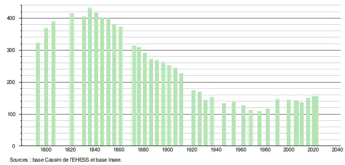 L'évolution du nombre d'habitants est connue à travers les recensements de la population effectués dans la commune depuis 1793. Pour les communes de moins de 10 000 habitants, une enquête de recensement portant sur toute la population est réalisée tous les cinq ans, les populations de référence des années intermédiaires étant quant à elles estimées par interpolation ou extrapolation[21]. Pour la commune, le premier recensement exhaustif entrant dans le cadre du nouveau dispositif a été réalisé en 2005[22].