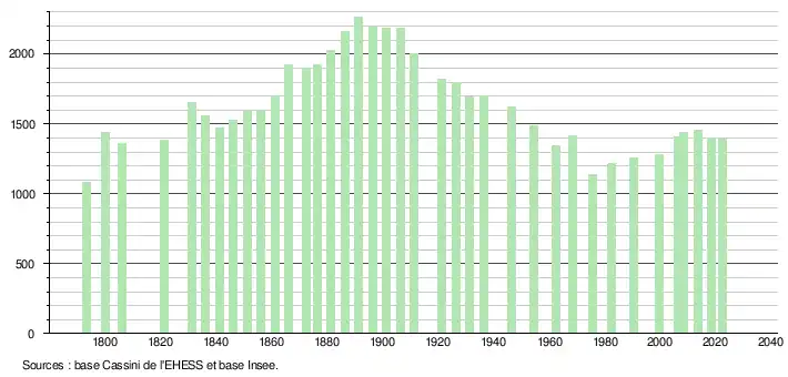 L'évolution du nombre d'habitants est connue à travers les recensements de la population effectués dans la commune depuis 1793. Pour les communes de moins de 10 000 habitants, une enquête de recensement portant sur toute la population est réalisée tous les cinq ans, les populations de référence des années intermédiaires étant quant à elles estimées par interpolation ou extrapolation[40]. Pour la commune, le premier recensement exhaustif entrant dans le cadre du nouveau dispositif a été réalisé en 2008[41].