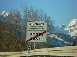 - ↑ Statuts de la région autonome Vallée d'Aoste, titre VIe : « La langue française et la langue italienne sont à parité en Vallée d'Aoste. Les actes publics peuvent être rédigés dans l'une ou l'autre langue, à l'exception des actes de l'autorité judiciaire, qui sont rédigés en italien. Les administrations de l'État prennent à leur service dans la Vallée, autant que possible, des fonctionnaires originaires de la Région ou qui connaissent le français. ».