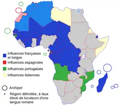 Le français est la langue romane la plus représentée sur le continent africain, avec 27 pays ayant le français comme langue officielle ou seconde, dont le plus peuplé est la République Démocratique du Congo qui compte près de 100 millions d'habitants en 2022. Ces états constituent l'Afrique francophone. La langue portugaise quant à elle compte, d'après les estimations de 2016, plus de 40 millions de locuteurs, répartis sur les 6 pays de l'ancienne Afrique portugaise.