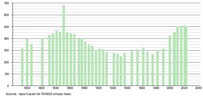 L'évolution du nombre d'habitants est connue à travers les recensements de la population effectués dans la commune depuis 1793. Pour les communes de moins de 10 000 habitants, une enquête de recensement portant sur toute la population est réalisée tous les cinq ans, les populations de référence des années intermédiaires étant quant à elles estimées par interpolation ou extrapolation[12]. Pour la commune, le premier recensement exhaustif entrant dans le cadre du nouveau dispositif a été réalisé en 2005[13].