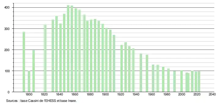 | L'évolution du nombre d'habitants est connue à travers les recensements de la population effectués dans la commune depuis 1793. Pour les communes de moins de 10 000 habitants, une enquête de recensement portant sur toute la population est réalisée tous les cinq ans, les populations de référence des années intermédiaires étant quant à elles estimées par interpolation ou extrapolation[23]. Pour la commune, le premier recensement exhaustif entrant dans le cadre du nouveau dispositif a été réalisé en 2008[24]. En 2022, la commune comptait 98 habitants[Note 3], en évolution de −4,85 % par rapport à 2016 (Hautes-Pyrénées : +1,59 %, France hors Mayotte : +2,11 %). |