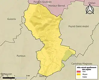 Le retrait-gonflement des sols argileux est susceptible d'engendrer des dommages importants aux bâtiments en cas d’alternance de périodes de sécheresse et de pluie. La totalité de la commune est en aléa moyen ou fort (44,5 % au niveau départemental et 48,5 % au niveau national). Sur les 71 bâtiments dénombrés dans la commune en 2019, 71 sont en aléa moyen ou fort, soit 100 %, à comparer aux 75 % au niveau départemental et 54 % au niveau national. Une cartographie de l'exposition du territoire national au retrait gonflement des sols argileux est disponible sur le site du BRGM[17],[Carte 2].
