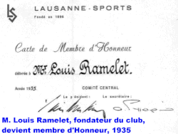 Carte de membre d’honneur de Louis Ramelet, fondateur du club, qui assiste à la fusion et au changement d'identité du Montriond-Sports en Lausanne-Sports.