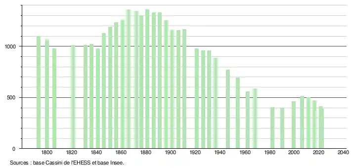 L'évolution du nombre d'habitants est connue à travers les recensements de la population effectués dans la commune depuis 1793. Pour les communes de moins de 10 000 habitants, une enquête de recensement portant sur toute la population est réalisée tous les cinq ans, les populations de référence des années intermédiaires étant quant à elles estimées par interpolation ou extrapolation[16]. Pour la commune, le premier recensement exhaustif entrant dans le cadre du nouveau dispositif a été réalisé en 2006[17].