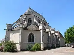 Monument imposant inscrit à l’inventaire des monuments historiques[20], XIIe-XVe pour la nef et les deux chapelles. En 1591, l’ensemble est dévasté. Fin XVIe, dans le prolongement des ruines est construit le chœur que l’on doit à Henri de Bourbon Montpensier, grand-père de la Grande Mademoiselle. Puis la nef est restaurée à la fin du XVIIe. Le clocher flanqué de quatre clochetons est incendié par la foudre le et n’a jamais été reconstruit.