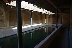 - dallage : les abords du bassin sont généralement dallés ou pavés afin que les lieux soient aisés à nettoyer, et sont munis d'une rigole ;