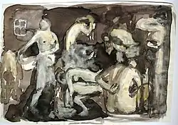 L'artiste a créé de nombreuses esquisses, études, croquis, d'après nature pour son tableau Le Bain [16]. Parmi ces études la plus connue se trouve au musée Russe. C'est une toile peinte à l'huile, 102 × 82,5 cm, (inventaire n° Ж-1909)[1]. L'étude montre six figures féminines, dont deux au premier plan, et quatre à l'arrière plan[17]. Selon l'historienne d'art Valentina Kniazeva, « cette étude captive de la féminité et des images poétiques est un transfert vivant de la nature ». Kniazeva remarque en même temps le caractère de scène d'intérieur du tableau [14]. Serebriakova a commencé à travailler à cette toile durant l'été 1912. Parfois on l'appelle la variante inachevée de son œuvre Le bain[8].
