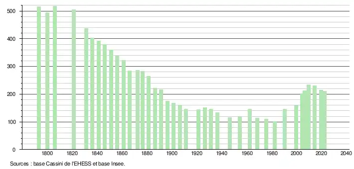 L'évolution du nombre d'habitants est connue à travers les recensements de la population effectués dans la commune depuis 1793. Pour les communes de moins de 10 000 habitants, une enquête de recensement portant sur toute la population est réalisée tous les cinq ans, les populations de référence des années intermédiaires étant quant à elles estimées par interpolation ou extrapolation[25]. Pour la commune, le premier recensement exhaustif entrant dans le cadre du nouveau dispositif a été réalisé en 2004[26].