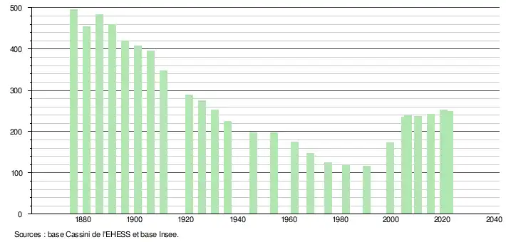 L'évolution du nombre d'habitants est connue à travers les recensements de la population effectués dans la commune depuis 1876. Pour les communes de moins de 10 000 habitants, une enquête de recensement portant sur toute la population est réalisée tous les cinq ans, les populations de référence des années intermédiaires étant quant à elles estimées par interpolation ou extrapolation[14]. Pour la commune, le premier recensement exhaustif entrant dans le cadre du nouveau dispositif a été réalisé en 2005[15].