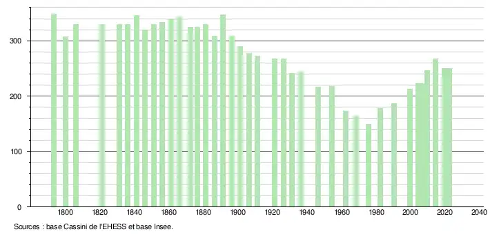L'évolution du nombre d'habitants est connue à travers les recensements de la population effectués dans la commune depuis 1793. Pour les communes de moins de 10 000 habitants, une enquête de recensement portant sur toute la population est réalisée tous les cinq ans, les populations de référence des années intermédiaires étant quant à elles estimées par interpolation ou extrapolation[19]. Pour la commune, le premier recensement exhaustif entrant dans le cadre du nouveau dispositif a été réalisé en 2004[20].
