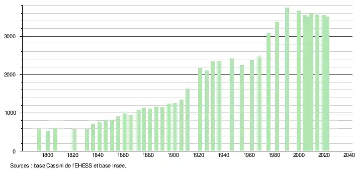 L'évolution du nombre d'habitants est connue à travers les recensements de la population effectués dans la commune depuis 1793. Pour les communes de moins de 10 000 habitants, une enquête de recensement portant sur toute la population est réalisée tous les cinq ans, les populations de référence des années intermédiaires étant quant à elles estimées par interpolation ou extrapolation[30]. Pour la commune, le premier recensement exhaustif entrant dans le cadre du nouveau dispositif a été réalisé en 2004[31].