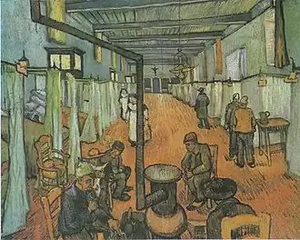 La pièce se compose de chaque côté de deux rangées de lits séparées par un très long couloir, elle est fermée au fond par une petite porte (le point de fuite des lignes de perspective) surmontée d'un grand crucifix. On aperçoit quelques religieuses s'affairant, alors que les malades se rassemblent autour du poêle situé au centre du couloir, pour se réchauffer. Seule une chaise à gauche (qui ressemble fortement à celle d'un autre célèbre tableau de Van Gogh) est vide : l'artiste semble vouloir suggérer sa présence-absence, comme s'il s'était levé un moment pour peindre la toile, ou comme s'il voulait témoigner de son internement forcé, et, en conséquence, son auto-isolement des autres patients. N'oublions pas que, en acceptant « ce métier de fou », de ce moment à sa mort, le peintre vivra dans une solitude en partie volontaire, en partie forcée.