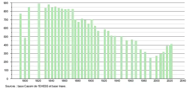 L'évolution du nombre d'habitants est connue à travers les recensements de la population effectués dans la commune depuis 1793. Pour les communes de moins de 10 000 habitants, une enquête de recensement portant sur toute la population est réalisée tous les cinq ans, les populations de référence des années intermédiaires étant quant à elles estimées par interpolation ou extrapolation[26]. Pour la commune, le premier recensement exhaustif entrant dans le cadre du nouveau dispositif a été réalisé en 2005[27].