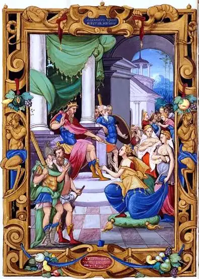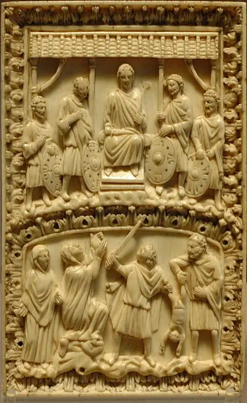 - Éléments constitutifs d'un jugement de Salomon : Salomon surélevé sur son trône, les deux mères, un soldat tenant un enfant vivant, un enfant mort déposé sur le sol et des courtisans.