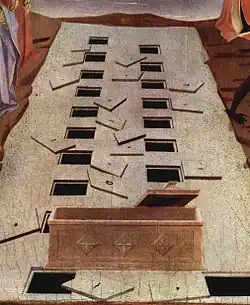 De facture gothique (parties dorées, scènes détachées les unes des autres, couleurs chatoyantes) Fra Angelico introduit la perspective du Quattrocento avec, au premier plan, le sarcophage ouvert qui renforce l'effet perspectif de l'alignement fuyant des tombes ouvertes séparant les deux groupes humains, et des paysages.