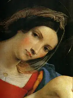 L’Enfant, porté par Marie en robe rouge éclatante avec des rabats bleu, tient la bague de mariage.