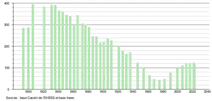 L'évolution du nombre d'habitants est connue à travers les recensements de la population effectués dans la commune depuis 1793. Pour les communes de moins de 10 000 habitants, une enquête de recensement portant sur toute la population est réalisée tous les cinq ans, les populations de référence des années intermédiaires étant quant à elles estimées par interpolation ou extrapolation[17]. Pour la commune, le premier recensement exhaustif entrant dans le cadre du nouveau dispositif a été réalisé en 2006[18].
