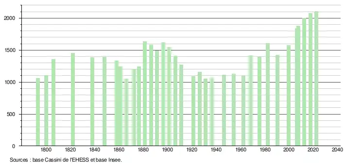 L'évolution du nombre d'habitants est connue à travers les recensements de la population effectués dans la commune depuis 1793. Pour les communes de moins de 10 000 habitants, une enquête de recensement portant sur toute la population est réalisée tous les cinq ans, les populations de référence des années intermédiaires étant quant à elles estimées par interpolation ou extrapolation[27]. Pour la commune, le premier recensement exhaustif entrant dans le cadre du nouveau dispositif a été réalisé en 2007[28].