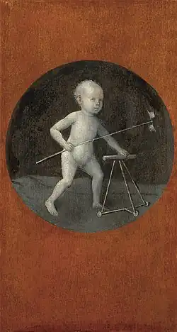 Au revers du panneau, au centre d'un glacis rouge orangé, Bosch a peint un tondo en grisaille représentant un petit enfant nu qui tient une girouette-jouet ou un tourniquet dans sa main droite et qui s'appuie de sa main gauche sur un trotteur dont il s'aide pour avancer vers le côté droit.