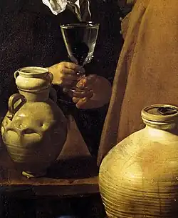 - ↑ Gállego, Julián, catálogo de la exposición Velázquez, 1990, p. 72-73. Elena Ramírez-Montesinos, «Objetos de vidrio en los bodegones de Velázquez», V Jornadas de Arte, Departamento de Historia del Arte, CSIC, Madrid, 1991, p. 403, soutient cependant que la figure interprétée habituellement comme une figue serait une décoration du verre caractéristique des plus précieuses pièces vénitiennes en verre soufflé et qui étaient également faites en Espagne par Cadalso de los Vidrios.