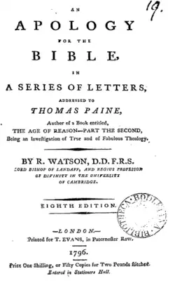 - Richard Watson, An Apology for the Bible, in a Series of Letters, addressed to Thomas Paine, Philadelphia, James Carey, 1979