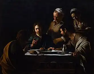Cette scène issue du Nouveau Testament (rapidement évoquée par saint Marc ; mais beaucoup plus en détail par saint Luc[13]) est traitée à la lettre par Caravage : Jésus, ayant ressuscité après sa crucifixion, est réputé apparaître à deux de ses disciples mais sous d'autres traits que ceux qu'il avait jusqu'alors. Après avoir conversé avec eux le long de la route qui les mène à Emmaüs, le soir venu, tous trois s'arrêtent pour se restaurer : c'est alors le moment de la révélation traité par le tableau.