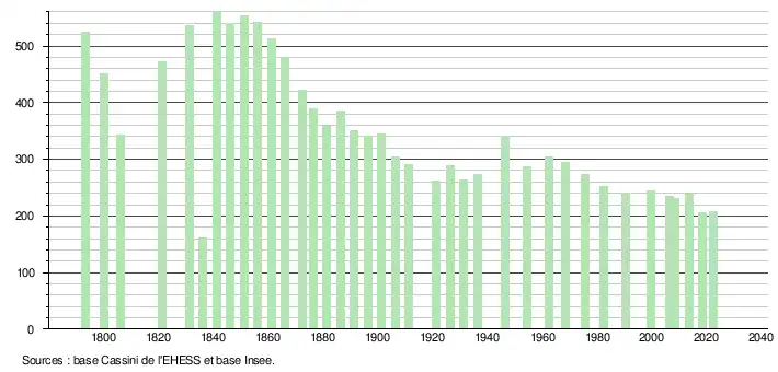 L'évolution du nombre d'habitants est connue à travers les recensements de la population effectués dans la commune depuis 1793. Pour les communes de moins de 10 000 habitants, une enquête de recensement portant sur toute la population est réalisée tous les cinq ans, les populations de référence des années intermédiaires étant quant à elles estimées par interpolation ou extrapolation[33]. Pour la commune, le premier recensement exhaustif entrant dans le cadre du nouveau dispositif a été réalisé en 2008[34].