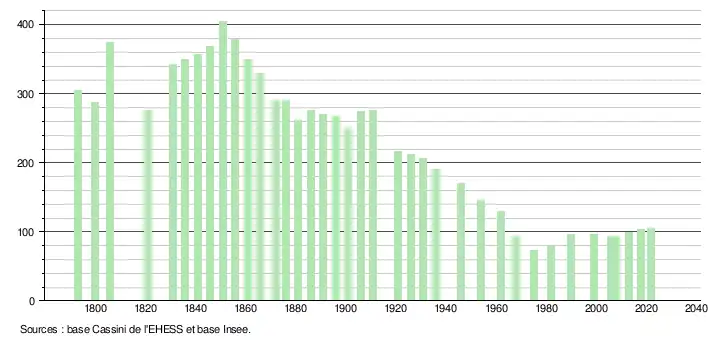- ↑ Population municipale de référence en vigueur au 1er janvier 2025, millésimée 2022, définie dans les limites territoriales en vigueur au 1er janvier 2024, date de référence statistique : 1er janvier 2022.