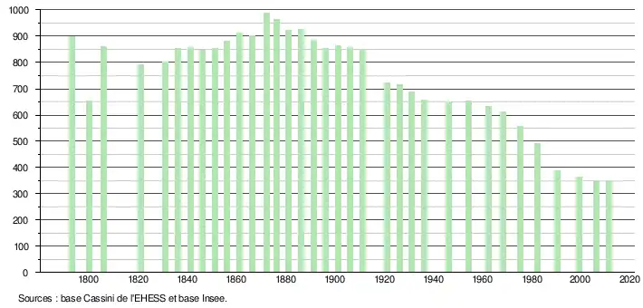 L'évolution du nombre d'habitants est connue à travers les recensements de la population effectués dans la commune depuis 1793. À partir du , les populations légales des communes sont publiées annuellement dans le cadre d'un recensement qui repose désormais sur une collecte d'information annuelle, concernant successivement tous les territoires communaux au cours d'une période de cinq ans. Pour les communes de moins de 10 000 habitants, une enquête de recensement portant sur toute la population est réalisée tous les cinq ans, les populations légales des années intermédiaires étant quant à elles estimées par interpolation ou extrapolation[13]. Pour la commune, le premier recensement exhaustif entrant dans le cadre du nouveau dispositif a été réalisé en 2006[14],[Note 1].