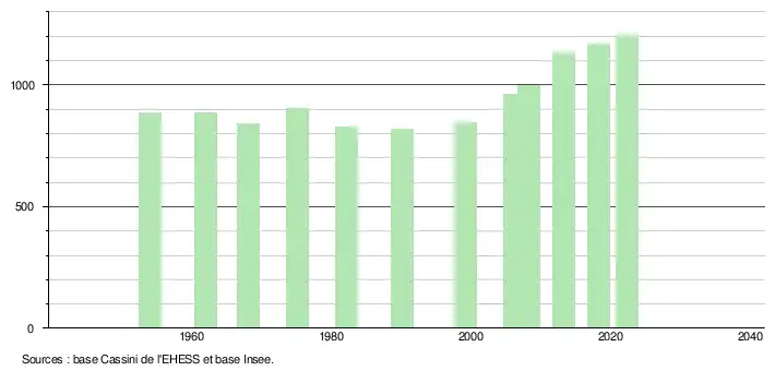 L'évolution du nombre d'habitants est connue à travers les recensements de la population effectués dans la commune depuis 1954. Pour les communes de moins de 10 000 habitants, une enquête de recensement portant sur toute la population est réalisée tous les cinq ans, les populations de référence des années intermédiaires étant quant à elles estimées par interpolation ou extrapolation[20]. Pour la commune, le premier recensement exhaustif entrant dans le cadre du nouveau dispositif a été réalisé en 2008[21].