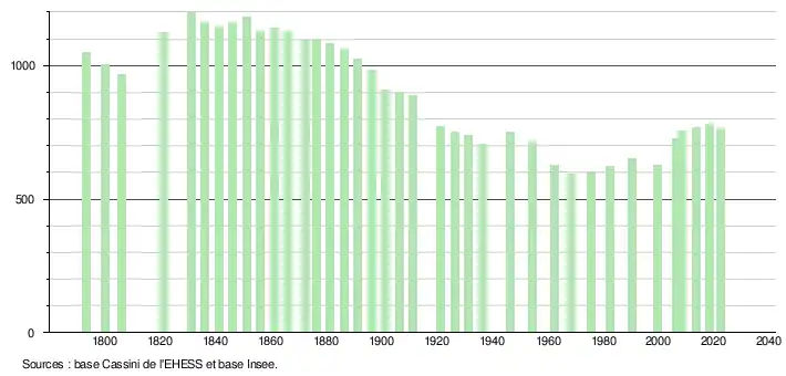 L'évolution du nombre d'habitants est connue à travers les recensements de la population effectués dans la commune depuis 1793. Pour les communes de moins de 10 000 habitants, une enquête de recensement portant sur toute la population est réalisée tous les cinq ans, les populations de référence des années intermédiaires étant quant à elles estimées par interpolation ou extrapolation[29]. Pour la commune, le premier recensement exhaustif entrant dans le cadre du nouveau dispositif a été réalisé en 2008[30].