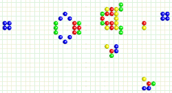 Détails sur la dynamique du réseau : ce « U » de sept cellules (également appelé « heptomino pi ») évolue vers une structure complexe et « organique » en passant par des formes très esthétiques. De plus, la structure est autoreproductible avec un déphasage, la nouvelle structure fille (itération 45) interférant avec une version de la structure mère (itération 15) en cours d’évolution. À l’itération 110, on obtient cette image de « clown ». Puis le réseau se stabilise sur une forme stable oscillante complexe[8].