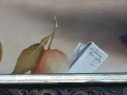 Au premier plan, une orange et des cerises apparaissent comme en trompe-l'œil près de la marge inférieure de la composition avec un cartellino portant la signature du peintre ainsi que la date de réalisation.