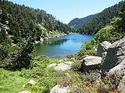 Lac d'Aude- Le lac des Bouillouses vu du nord (à gauche, la commune des Angles).