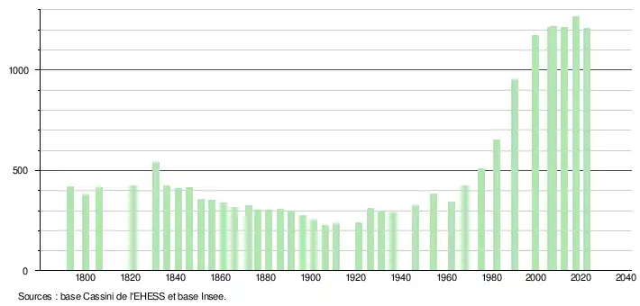 L'évolution du nombre d'habitants est connue à travers les recensements de la population effectués dans la commune depuis 1793. Pour les communes de moins de 10 000 habitants, une enquête de recensement portant sur toute la population est réalisée tous les cinq ans, les populations de référence des années intermédiaires étant quant à elles estimées par interpolation ou extrapolation[20]. Pour la commune, le premier recensement exhaustif entrant dans le cadre du nouveau dispositif a été réalisé en 2007[21].