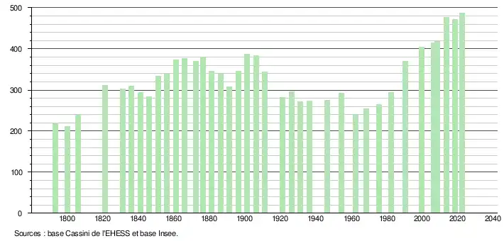 L'évolution du nombre d'habitants est connue à travers les recensements de la population effectués dans la commune depuis 1793. Pour les communes de moins de 10 000 habitants, une enquête de recensement portant sur toute la population est réalisée tous les cinq ans, les populations de référence des années intermédiaires étant quant à elles estimées par interpolation ou extrapolation[16]. Pour la commune, le premier recensement exhaustif entrant dans le cadre du nouveau dispositif a été réalisé en 2008[17].