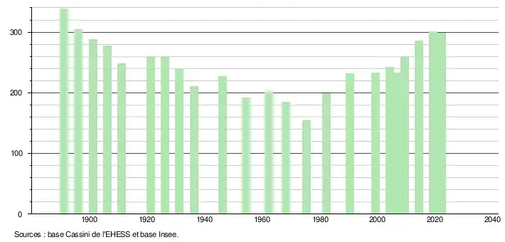 L'évolution du nombre d'habitants est connue à travers les recensements de la population effectués dans la commune depuis 1891. Pour les communes de moins de 10 000 habitants, une enquête de recensement portant sur toute la population est réalisée tous les cinq ans, les populations de référence des années intermédiaires étant quant à elles estimées par interpolation ou extrapolation[22]. Pour la commune, le premier recensement exhaustif entrant dans le cadre du nouveau dispositif a été réalisé en 2004[23].