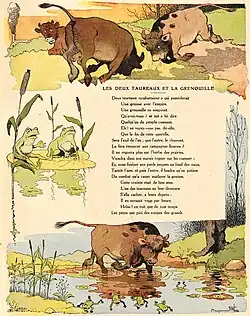 - ↑ Phèdre (trad. Ernest Panckoucke), « LES GRENOUILLES REDOUTANT UN COMBAT DE TAUREAUX »,