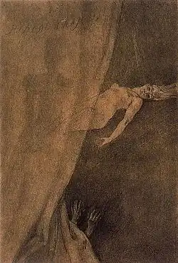 - ↑ Alric DELAPORTE, « Félicien Rops et l'illustration des Diaboliques de Jules Barbey d'Aurevilly : divagations et artifices sur la genèse des œuvres » dans Marie Gispert, Catherine Méneux, Emmanuel Pernoud et Pierre Wat (ed.), Actes de la Journée d’études Actualité de la recherche en XIXe siècle, Master 1, Années 2013 et 2014, Paris, site de l’HiCSA, mis en ligne en janvier 2015.