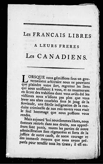 - ↑ Edmond-Charles Genêt, « Les Français libres à leurs frères les Canadiens », 1793 (lire en ligne).