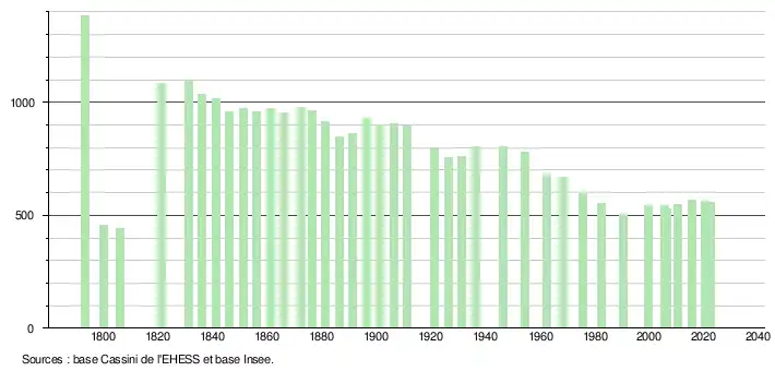 L'évolution du nombre d'habitants est connue à travers les recensements de la population effectués dans la commune depuis 1793. Pour les communes de moins de 10 000 habitants, une enquête de recensement portant sur toute la population est réalisée tous les cinq ans, les populations de référence des années intermédiaires étant quant à elles estimées par interpolation ou extrapolation[31]. Pour la commune, le premier recensement exhaustif entrant dans le cadre du nouveau dispositif a été réalisé en 2005[32].
